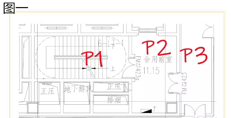 防煙樓梯間,門開往疏散方向(疏散示(shì)意如下(xià)圖),假如(rú)P1壓力值>P2壓力值(zhí)>P3壓力值,壓力值差為1000pa,門能否打開(kāi)?人能否推得動?